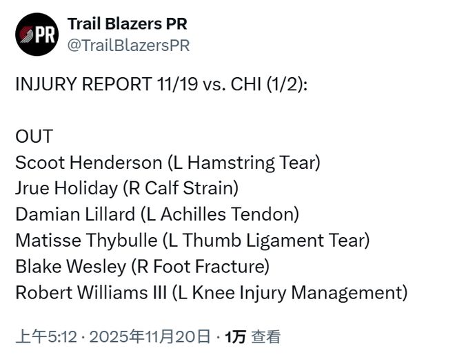北京时间11月20日,开拓者更新伤病名单,除了利拉德、霍勒迪、亨德森、塞布尔、韦斯利这些球员,中锋罗伯特-威廉姆斯也将因膝伤管理缺席今天对公牛的比赛。对于上一场表现出色的杨瀚森来说,他有望获得更多的上场机会。